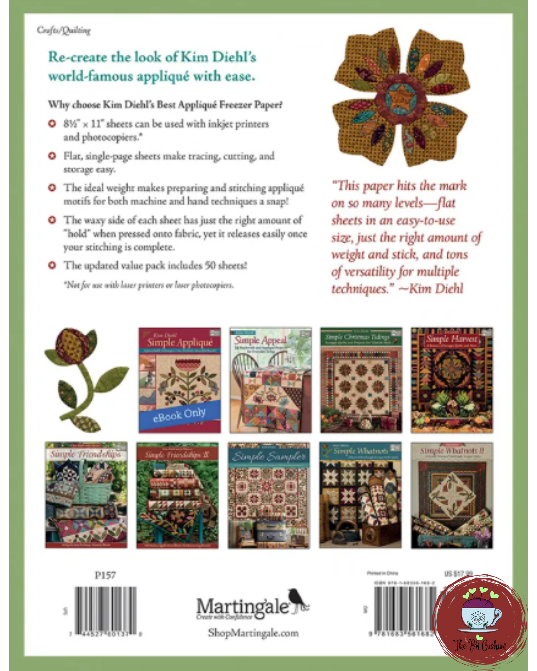 Discover Kim Diehl's secret to applique success. Enjoy the quality product that bestselling author Kim Diehl uses for her invisible machine-applique method to create instant tracing templates and pattern pieces for hand or machine applique. Includes 50 sheets of 8.5" x 11" freezer paper.